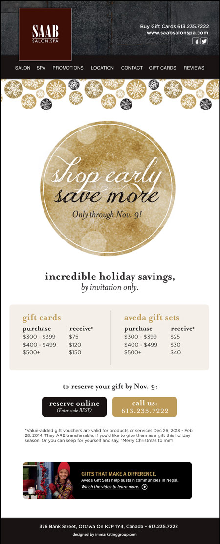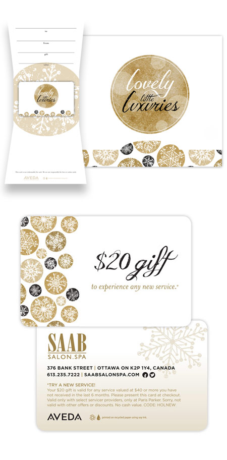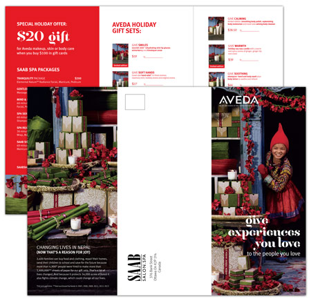 • For in-store and direct mail use For fastest turnaround, we recommend direct mail be handled from your local post office. Just add clear mailing tabs and label! Bi-fold (4 color, folded 9"x4") Tri-fold (4 color, folded 9"x4") Order by 10/1 for delivery week of 10/14 • Includes Aveda gift sets and photos, up to 10 spa packages and gift cards for 3 set amounts $850 Order by 10/1 for 10/12 launch • Triggers early buying with special tiered offers for VIP guests only $710 Order by 10/1 for 10/12 launch • Increases gift card sales up to 30% • Kick-off email (email include design & send) $2685 (a $3650 value) Order by 10/11 for 11/1 launch • Coordinates with holiday offer and collateral